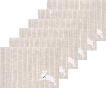 Featuring a neutral background with delicate white stripes, the White Bunny Hop Stripe woven table linen collection is adorned with a charming white leaping rabbit, complete with a delicate bow around its neck. Perfect for hosting elegant Easter celebrations, these linens add a touch of whimsy and sophistication to any table setting.