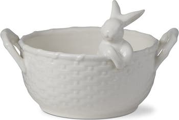 - This classic white bowl pairs perfectly snacks or brunch entertaining. This dish features debossed & sculpted design with a white glaze finish. Playful earthenware bunny basket bowl.