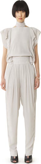 The Charmeuse fabric used for these pants is distinguished by its extreme fineness, flow and satin-like appearance. These characteristics are achieved thanks to an ancient Japanese technique and the use of pure water during the manufacturing process. It pays homage to the elegant drapes designed by Jeanne Lanvin for her Haute Couture creations, with sophisticated pleats that structure and elongate the silhouette. When worn with the matching top, it maintains a polished look thanks to its crease-resistant fabric.