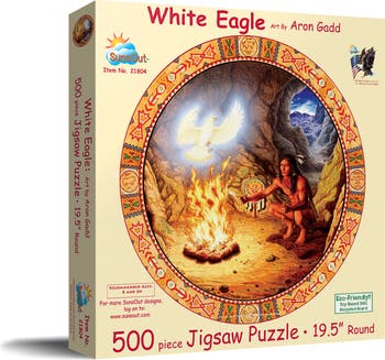 Unleash the Spirit of the White Eagle with the 500 piece jigsaw puzzle by Aron Gadd, an enchanting representation of Western Americana artistry that brings mystique to puzzle-solving. Crafted by SunsOut, a woman-owned small business, this round puzzle is proudly made in the USA of high-quality recycled cardboard for durability and perfect fit. SunsOut's attention to detail ensures a seamless assembly, reducing frustration and enhancing the joy of puzzling. Embrace eco-friendly artistry, as SunsOut utilizes soy-based inks and top-grade recycled materials designed specifically for jigsaw puzzles, demonstrating a commitment to sustainability and environmental responsibility. Each puzzle is a testament to the brand's commitment to quality and customer satisfaction, supported by a robust warranty that addresses any issues with missing or damaged pieces swiftly and efficiently. As part of the SunsOut community, you are supporting a brand dedicated to quality and artistry and standing by American values. This puzzle not only provides a fulfilling artistic venture but also contributes to protecting the planet, making it a perfect addition to your collection. Join this creative journey and enjoy the satisfaction of completing a piece of art imbued with the exceptional artistry of licensed works by distinguished artists like Aron Gadd.