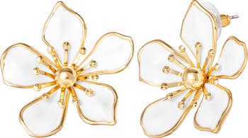 White Enamel Flower Earrings for Women, Gold-Tone Flower Stud Earrings