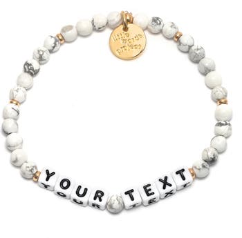 Imitation howlite stones and golden beads charm this customizable stretch bracelet that lets you add a playful statement of up to 13 characters to your wrist.