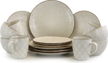 Freshen up your table setting with the stunning White Lilly 16 Piece Dinnerware Set by Elama. With a refreshing tone of Off-White and textured Ogee patterned plates, this set is ready to make a statement at your next gathering. Stoneware construction of each dish is ideal for special occasion gatherings and durable for every day use. Each piece is microwave safe for quick reheating and dishwasher safe for easy cleaning.