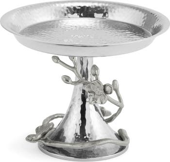 Sculptural orchids blossom delicately from the twig-inspired accents of this hammered stainless steel candy dish that brings artisan beauty to your next dinner party.