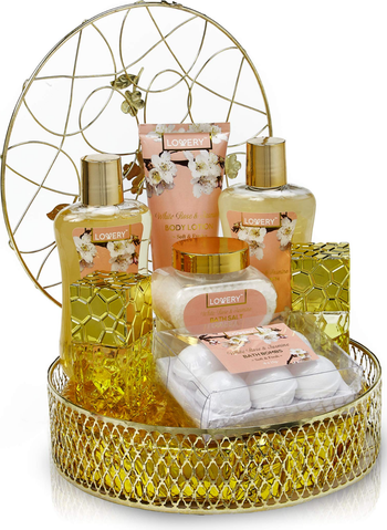 Deluxe 13 piece set - this spa gift basket has everything a woman needs! It includes shower gel, bubble bath, body lotion, bath salt, body spray, perfume and 6 bath bombs. Packed in a stunningly wrapped wire basket, it also has a gift note card for you to personalize it.