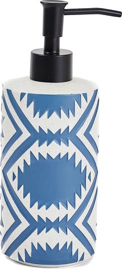 An intricately engraved geometric pattern brings eye-catching dimension to this lotion dispenser crafted from premium stoneware.