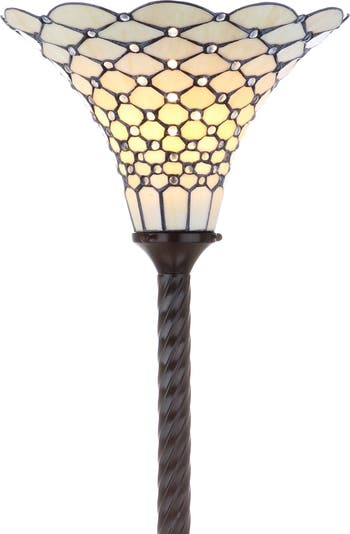 One of the finest techniques to come out of the Art Nouveau movement, the Tiffany-style stained glass shade on this torchiere floor lamp makes for a stunning addition to any space. While steeped in traditional design, this piece is updated with the functionality expected today -- a step-on on/off button, LED bulb compatibility, and a beautiful silk-wrapped cord. Each shade is hand-made by artisans who specialize in the intricate art of stained glass soldering.
