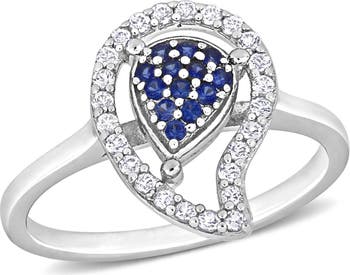 Embrace the captivating elegance and luminous design of this teardrop halo ring. Crafted in luminous sterling silver, the ring features a magnificent teardrop-shaped created blue sapphire at its center, offering a rich, deep hue. This striking stone is beautifully framed by a sparkling halo of brilliant white topaz. With a total gemstone weight of three-eighths carat, this piece delivers a sophisticated, continuous flash of light and color, making it a graceful and cherished accessory.