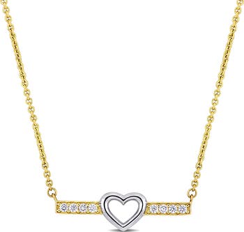 Make her heart flutter with this heart bar necklace. Crafted in lustrous yellow and white gold, it features eight round-cut white topaz gemstones placed on the bar and a white gold open heart resting at its center. This gemstone necklace measures 17-inches long and secures with a lobster clasp for a long-lasting durability. This flattering gold and gemstone heart necklace makes the perfect addition to any jewelry collection.