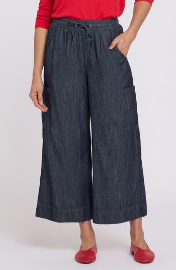 Relaxed and refined, these denim cargo pants flaunt a drawstring waist and ankle-length legs cut in a modern wide-leg silhouette.