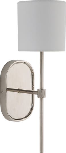 A fine, light-diffusing linen shade makes an elegant counterpoint to the high-polished nickel plate of this sconce that's a handsome addition to your refined decor, whether installed indoors or outside.