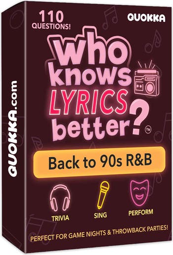 Get ready for a music-filled, fast-paced trivia experience with the Who Knows Music Better? game series. Featuring multiple editions focused on different decades and genres, including the 90s & 2000s Hip-Hop & R&B and Who Knows Lyrics Better? 90s R&B edition, this ultimate music challenge brings the best of music trivia to your game nights. With over 500 to 1610 questions, the games cover everything from world’s greatest hits to specific songs, lyrics, and artists, perfect for music lovers, family gatherings, and parties. These trivia games are designed to bring people together, testing your knowledge on music history, lyrics, and artists while adding fun challenges like karaoke and sing-offs. Whether you're a fan of the classics or into modern beats, this game has something for everyone, making it a great choice for all ages. No screens, no setup – just music, laughter, and great memories.