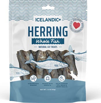WHOLE FISH: HERRING - CAT TREAT 1OZ - Give your cat the simple, crunchy goodness they crave with Icelandic+ Herring Whole Fish Cat Treats. Made from just one ingredient—100% wild-caught whole herring—these natural treats are gently air-dried to lock in irresistible flavor and key nutrients. No additives, preservatives, or artificial ingredients—just pure fish. Packed with protein and naturally rich in Omega-3 fatty acids, these nutrient-dense treats help support healthy skin, a shiny coat, brain function, and joint health. Their crunchy texture also helps reduce plaque and tartar to promote better dental health. Perfect for cats with food sensitivities or on limited-ingredient diets, they’re easy to digest and oh-so tasty. Serve them whole for a satisfying chew or break them into smaller pieces as a meal topper or training reward. However you offer them, your feline friend will love the flavor and crunch of these wholesome fish treats. The best treats for the most loved pets. KEY HIGHLIGHTS: High-protein, single ingredient, nutrient-dense treat. Rich in Omega 3 fatty acids to support healthy skin & coat. No artificial colors, fillers or preservatives. Grain & wheat free. Crunchy texture promotes dental health. INGREDIENTS: Herring. GUARANTEED ANALYSIS: Crude Protein (Min) 58.0%, Crude Fat (Min) 26%, Crude Fiber (Max) 1.0%, Moisture (Max) 9.0%, Omega 3 Fatty Acids* (Min) 5.0%, Taurine* (Max) 0.2%. CALORIE CONTENT (CALCULATED ME): 4,400 kcal/kg, 124.7 kcal/oz.