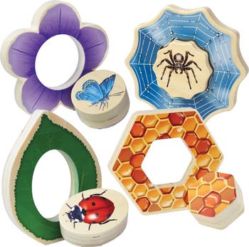 - Set of four, two-piece puzzles: Butterfly and flower, Ladybird/bug and leaf, Honeybee and honeycomb, Spider and web