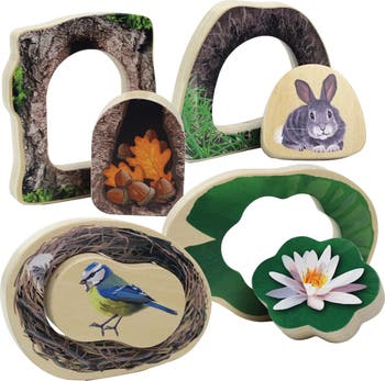 - Set of four, two-piece puzzles: Bird and nest, Frog and lily pad, Rabbit and burrow, Squirrel and tree