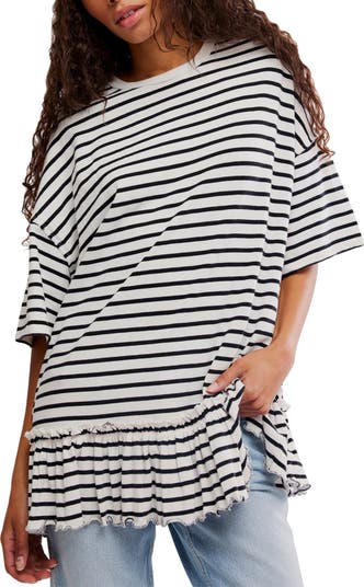 Play up the casual charm in this oversized striped T-shirt cut with a softy ruffled hem and dropped shoulders.
