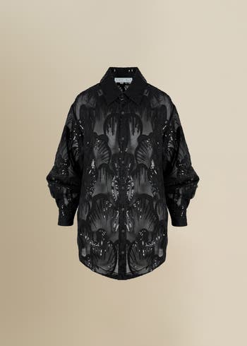 This sheer, oversized shirt dress is loose fitting. Meant to be styled alone, with another dress over top, or open - it is versatile. Detailed embroidered tulle.