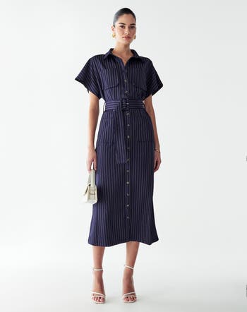 The wichita midi dress by willa is a sophisticated pinstripe midi dress that effortlessly transitions from office to evening. designed with a classic button-through silhouette, this dress offers a refined take on workwear with its tailored lines and elegant proportions. the navy pinstripe fabric creates a sleek, polished look that speaks to modern professional style.