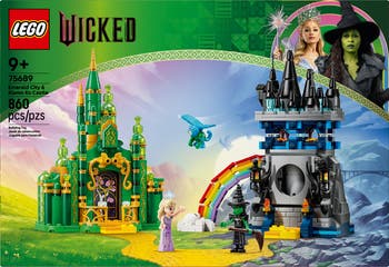 Includes: Two building toy sets with LEGO Wicked Elphaba and Glinda minidolls, a flying monkey figure and a buildable rainbow.