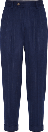 The classic chalk stripe pattern runs across the soft wool and cashmere flannel in an elegant wide stripe version. The fabric is lightweight while still being soft and warm, an essential quality on cold days. The knee-length cupro lining provides the garment with added comfort.