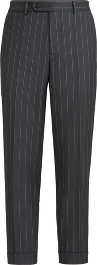 The sartorial taste of the wide chalk stripe is enhanced by the sophisticated quality of the pure wool 150s twill. The processing of the very fine yarn allows the creation of a lightweight fabric that is also compact and very comfortable.