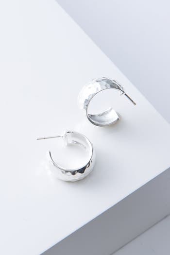 These chunky hammered metal hoop earrings are handcrafted by master Artisans in Peru. Using silver plated bronze, the Artisans hammer each piece by hand to create the perfect textured look. The minimalist silver earrings have a steel post, making them ideal for everyday wear and for those with sensitive ears.