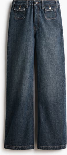 Jeans in rigid cotton denim that feels firm at first but then softens and loosens with wear. Wide leg with a regular fit from the waist to the hip and a wide cut from the thigh to the hem. High waist with a zip fly and button. Flap front pockets with a button and open back pockets. Regular length, designed to hit the top of the foot with little or no stacking. Inspired by the 70s, designed for today.