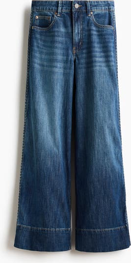 5-pocket jeans in denim with a slight stretch for good comfort. Wide leg with a regular fit from the waist to the hip and a wide cut from the thigh to the hem. High waist with a zip fly and button. Braided trim down the sides and a sewn-in turn up at the hems. Regular length, designed to hit the top of the foot with little or no stacking. Inspired by the 70s, designed for today.