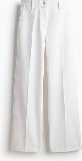 Jeans in rigid cotton denim that feels firm at first but then softens and loosens with wear. Wide leg with a regular fit from the waist to the hip and a wide cut from the thigh to the hem. High waist with a zip fly and button. Diagonal side pockets, fake welt pockets at the back and creases down the front. Longer length, designed to fall over the foot with a stacking effect. A denim statement that goes the distance.