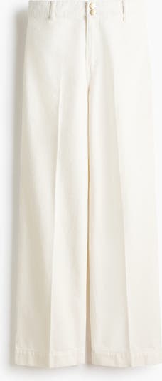 Jeans in rigid cotton denim that feels firm at first but then softens and loosens with wear. Wide leg with a regular fit from the waist to the hip and a wide cut from the thigh to the hem. High waist with a zip fly and two buttons, and creases down the front and back. Regular length, designed to hit the top of the foot with little or no stacking.