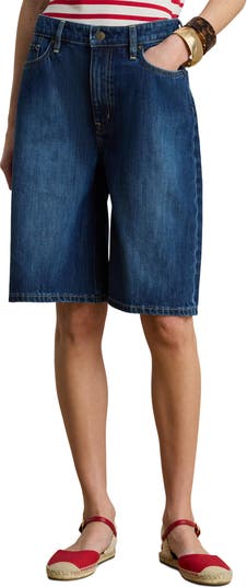 Wide-leg Bermuda shorts made from rigid nonstretch denim with a faded finish offer a comfy, flattering fit.
