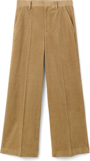 Wide-wale corduroy brings cool-weather style and a plush feel to these dramatic trousers made with a mid-rise waist and a full-length column silhouette.