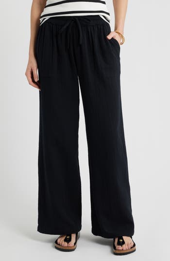 Cut from breathable cotton gauze, these lightweight pants are topped with a comfy elastic waist and finished with flowy wide leg.