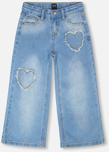 The wide leg jeans in light blue denim bring a playful twist to a timeless favorite. This pair features real front and back pockets, heart-shaped embroidery, belt loops, and a button closure for an authentic denim feel. Made from soft stretch cotton denim, they combine comfort, durability, and a dash of sweetness for every girl’s adventures.