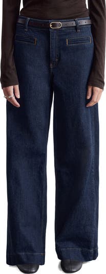 Welt pockets and wide legs bring a '70s-inspired aesthetic to stretch-kissed jeans featuring a dark wash for day-to-night versatility.