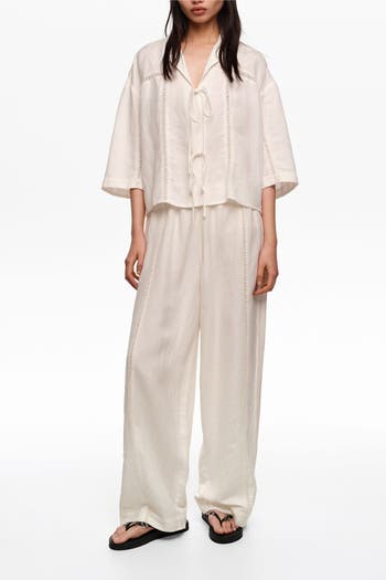 Straight, wide-leg trousers in a linen blend with a low-rise waist. Designed with side seam pockets and a waistband with inner elastic and lace strip details throughout the garment.