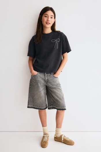 Relaxed-fit, 5-pocket, knee-length shorts in cotton denim with a gentle stretch for good comfort. Low waist, adjustable waistband, and zip fly with button. Wide legs.