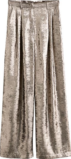 Infused with festive glamour, these wide-leg pants shimmer in lightweight metallic fabric that catches the light with every move. Soft pleating enhances their fluid, floaty silhouette, while the recycled-fabric construction adds a thoughtful touch behind the sparkle.
