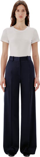 Our iconic Wide Leg Pant joins the classic tailoring lineup as a quintessential modern trouser. This high waisted style sits at the true waist and falls full-length down the leg, elongating the body. The style runs small, and we recommend sizing up. We have visited our wool-supplying farms to ensure that their sheep are raised and sheared in exemplary conditions, free of the cruel practice of mulesing. The fibers for this garment come from a farm in New South Wales. The fabric is processed and finished in an Italian facility that runs on 100% renewable energy. Adding a small amount of elastane to the garment improves strength and performance, helping to extend the piece's lifetime.
