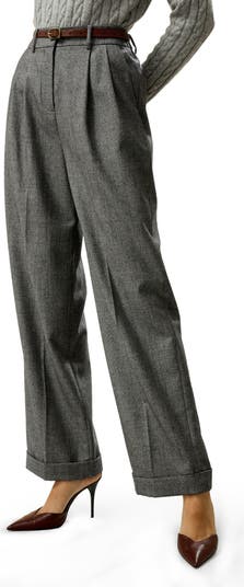 Wide-leg wool-flannel suit trousers are made of 103% wool and are covered in fluff, affording a rustic look and a soft hand. Flannel has good elasticity and stores heat and insulates against the cold, which is lightweight, durable, and glossy, good to drape. The trousers are less prone to pilling or deformation. It is perfect for work environments that require business attire, such as offices and professional settings.