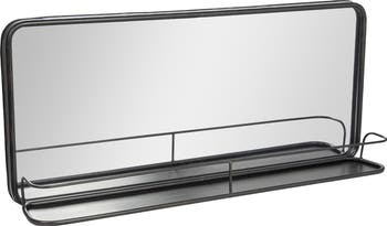 Add functionality and style to the home with this black metal framed rectangle wall mirror with a shelf. This sleek and contemporary wall mirror features a black metal frame with an attached shelf. The black metal frame adds some contrast and elegance to the wall, while the rectangular shape reflects light and opens up the space. The attached shelf adds convenience and storage space for essentials, such as toiletries, cosmetics, or accessories. This wall mirror is ideal for adding functionality and style to any living space, such as a bathroom, bedroom, or entryway. Hang it on its own or as part of a gallery wall. This wall mirror comes with hanging mechanisms for easy installation. It can be hung vertically. This wall mirror is made of metal, glass, and reclaimed wood, making it sturdy and durable. It measures 36 inches long and 16 inches high, making it a perfect size for any space. This mirror is a stunning piece that will add a touch of sophistication to any home.