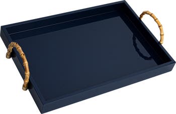 - A navy wood and metal tray, combining the warmth of wood with a sleek, maritime finish