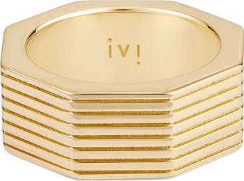 Linear etchings texture an 18-karat gold plated octagonal band ring that'll heighten the geometric intrigue of any ensemble.
