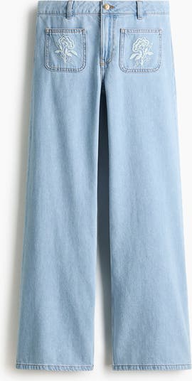 Jeans in rigid cotton denim that feels firm at first but then softens and loosens with wear. Wide legs with a regular fit from the waist to the hip and a wide cut from the thigh to the hem. Regular waist with a zip fly and button. Patch pockets with an embroidered motif at the front, and patch back pockets.
