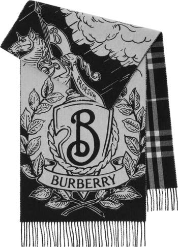 A scarf made in Italy from cashmere, jacquard-woven with our Equestrian Knight Design and B crest set against a stormy night’s sky. The design reverses to the Burberry Check and the fabric is washed for an ultra-soft finish and raised nap.||Rectangular|Fringing at both ends|Jacquard-woven Burberry lettering at ends