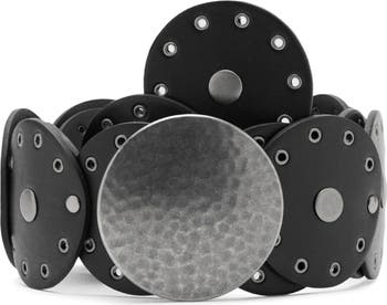 Scalloped edges bring a unique texture to a wide faux-leather belt highlighted by polished stud hardware to illuminate any look.