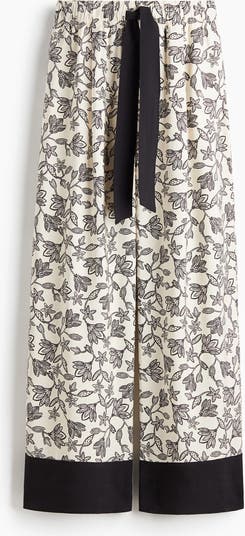 Trousers in modal-blend twill featuring a high, elasticated waist with a wide drawstring. Discreet side pockets, a fake welt pocket at the back and wide legs.