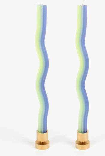 Wiggle Candles combine a functional dining candle with fun, joy, and experiment. Bright color combinations are squeezed together in an undulating shape to create a sense of motion. Designed by Dutch designer Lex Pott, each pack of two fits standard candleholders and adds playful style to any table.