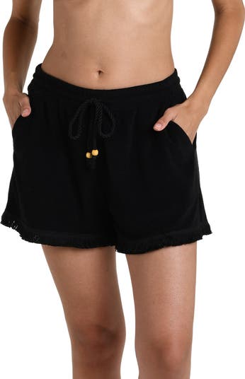 Relax after a swim in these terry cover-up shorts featuring a fringe trim for breezy appeal.