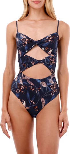 Front twists and skin-baring cutouts detail the front of this vacay-ready one-piece swimsuit that dries quickly and retains its shape with ease.